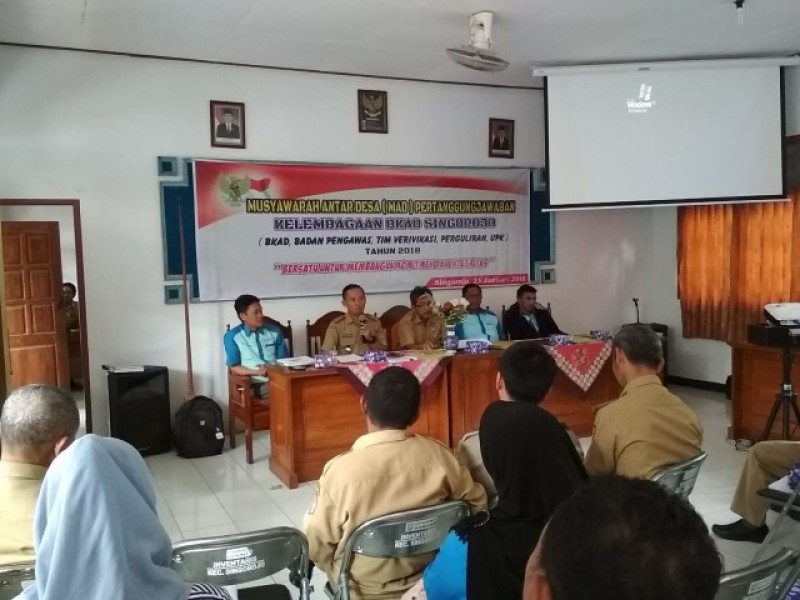 SINGOROJO (23/1/2018). Pelaksanaan Musyawarah Antar Desa (MAD) Kelembagaan BKAD (Badan Kerja Sama Antar Desa) Kecamatan Singorojo telah terlaksana dengan lancar pada tanggal 23 Januari 2018 bertempat di Aula Kecamatan Singorojo. Dalam kesempatan penting itu di hadiri langsung oleh Kepala Dinas Pemberdayaan Masyarakat dan Desa Kabupaten Kendal Ir. Subaedi dan Camat Singorojo Toni Ari Wibowo, AP., MM.